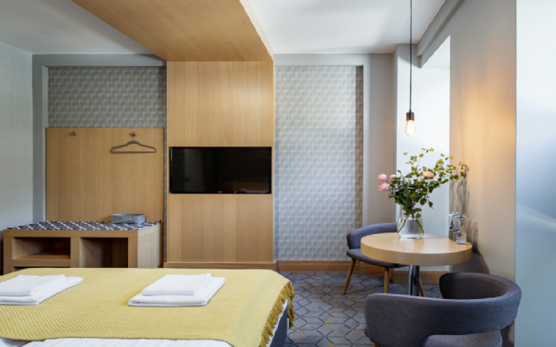 Pokój dwuosobowy o powierzchni 19 m² jest wyposażony w łazienkę, płaski telewizor i lodówkę. Nowoczesny wystrój i dbałość o detale to dodatkowy atut.
